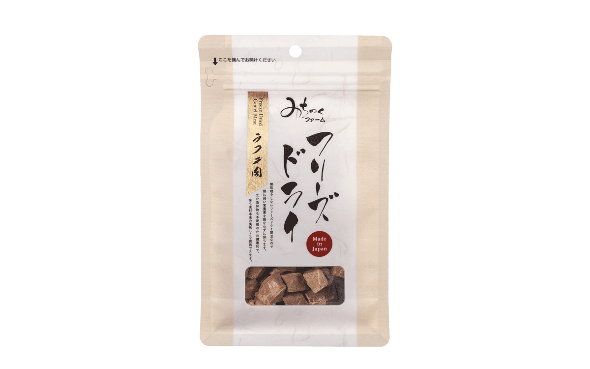 Michinoku Farm’s freeze-dried camel meat treats are sourced from camels raised in the pristine deserts of Australia. Camel meat offers a beef-like flavor, high in protein and low in cholesterol, making it a healthy alternative for your pets. Ideal for dogs that are tired of their usual meat or for those who simply love meat, these treats provide a delicious and nutritious option. The freeze-drying process preserves the rich taste and essential nutrients, ensuring a premium treat for your beloved pets.