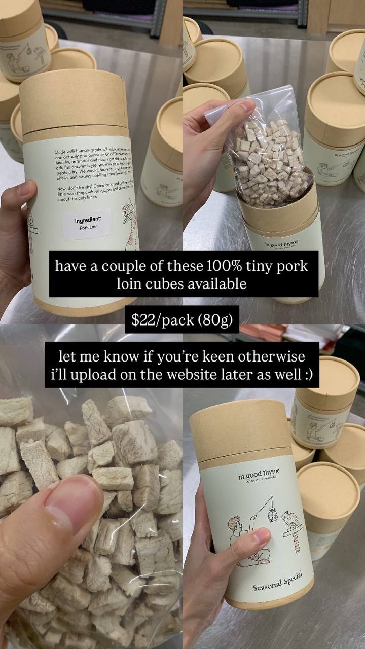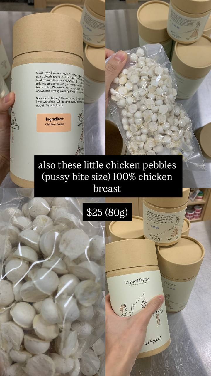 Single ingredient chicken breast (pebble shaped) or pork loin (cube shaped) treats.